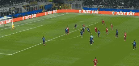 直到第38分钟,国米才完成了本场的第一次射门,巴雷拉的任意球绕过人墙,稍稍偏出。