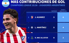 本赛季阿根廷球员欧冠参与进球榜:阿尔瓦雷斯6粒居首